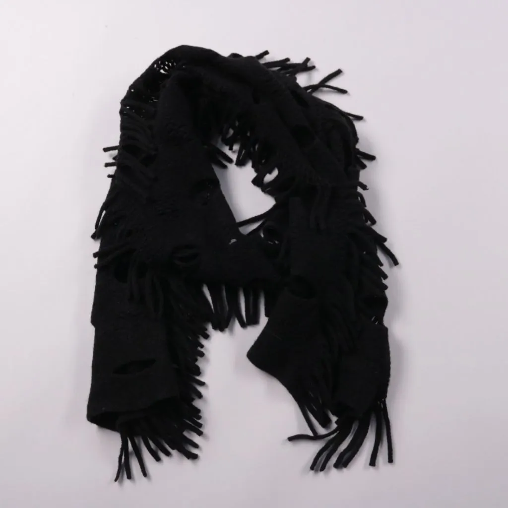 Чёрный шарф с бахромой по краям, без видимого брендинга. Подойдёт для повседневных зимних образов и для утепления в холодную погоду. Удобно драпируется и добавляет дополнительную защиту шее от ветра.