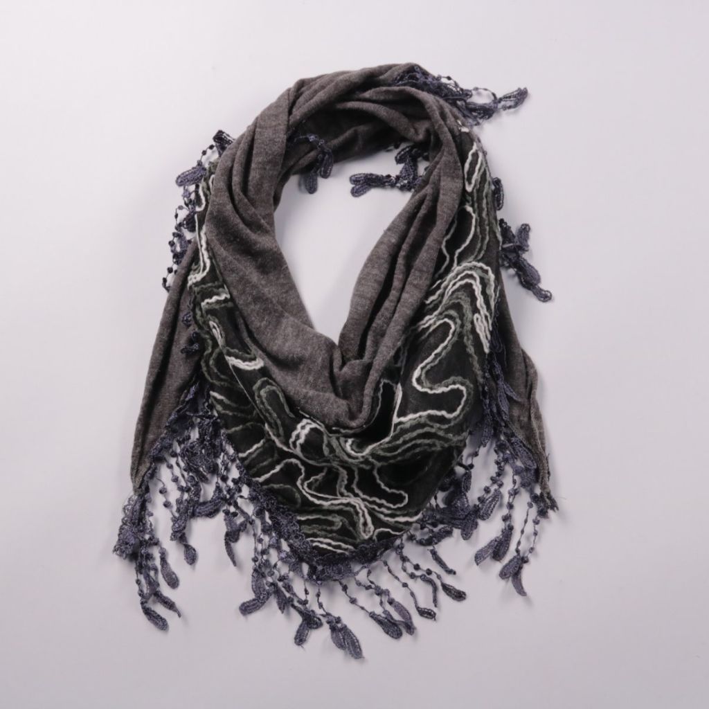 Шарф-косынка тёмно-серого цвета с контрастным узором и декоративной бахромой по краю. Подойдёт для повседневных образов в прохладную погоду, можно носить на шее или накидывать на плечи. Лёгкий и мягкий, удобно складывается и не занимает много места в с...