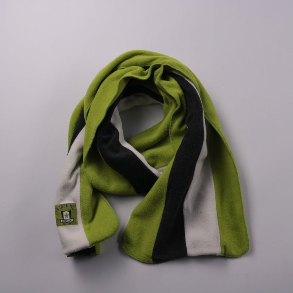 Флисовый шарф Starling College в зелёно-бело-чёрную полоску с нашивкой-эмблемой. Подойдёт для зимних прогулок и повседневных образов, хорошо сочетается с однотонной верхней одеждой. Мягкий материал приятен к коже и быстро сохнет после стирки.