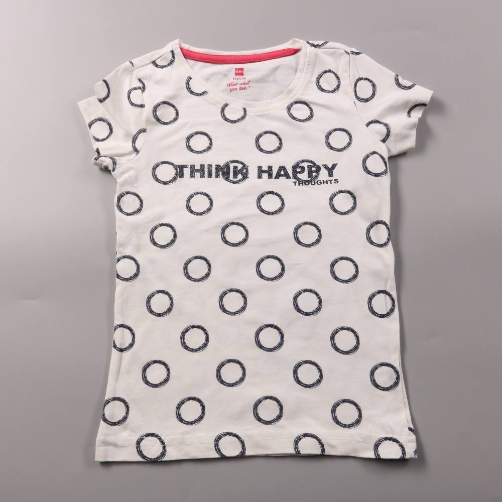 Футболка HEMA белого цвета с принтом в виде тёмных кругов и надписью спереди. Подойдёт для повседневной носки летом или для садика/школы на физкультуру. Лёгкий трикотаж удобно носить и просто стирать.