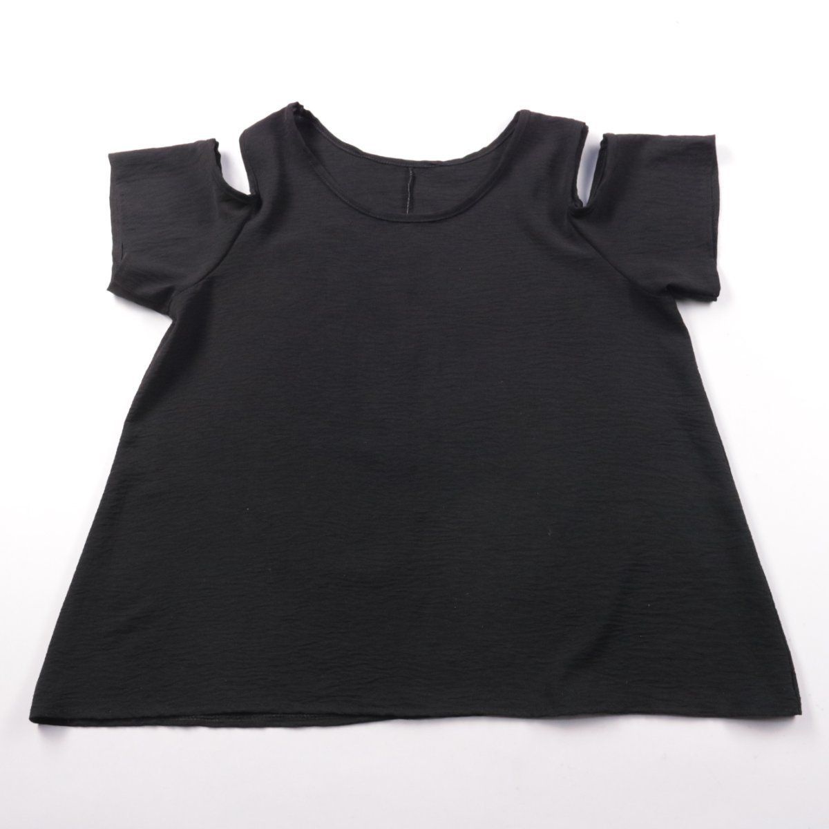 Детская футболка для девочки в чёрном цвете с открытыми плечами. Подойдёт для повседневной носки летом или в помещении, легко сочетается с юбками и шортами. Мягкий трикотаж хорошо тянется и не сковывает движения.