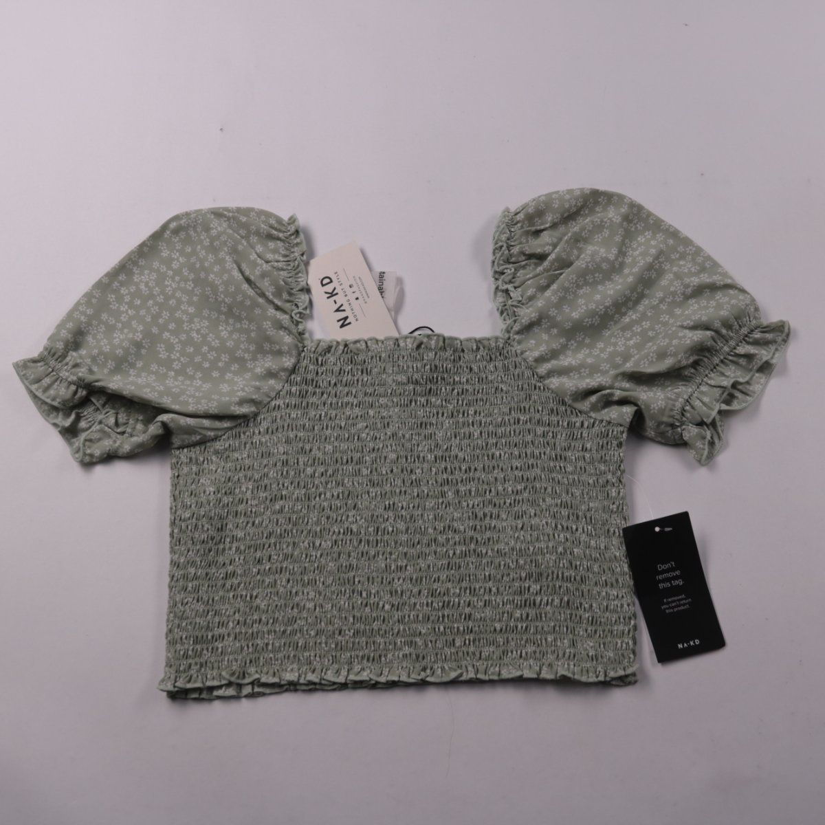 Детский топ NA-KD оливково-зелёного цвета с мелким цветочным принтом, со сборкой (смокинг) по всему корпусу и пышными рукавами. Подойдёт для летних прогулок и праздников, хорошо смотрится с шортами или юбкой. Эластичная сборка тянется и комфортно садится по фигуре.