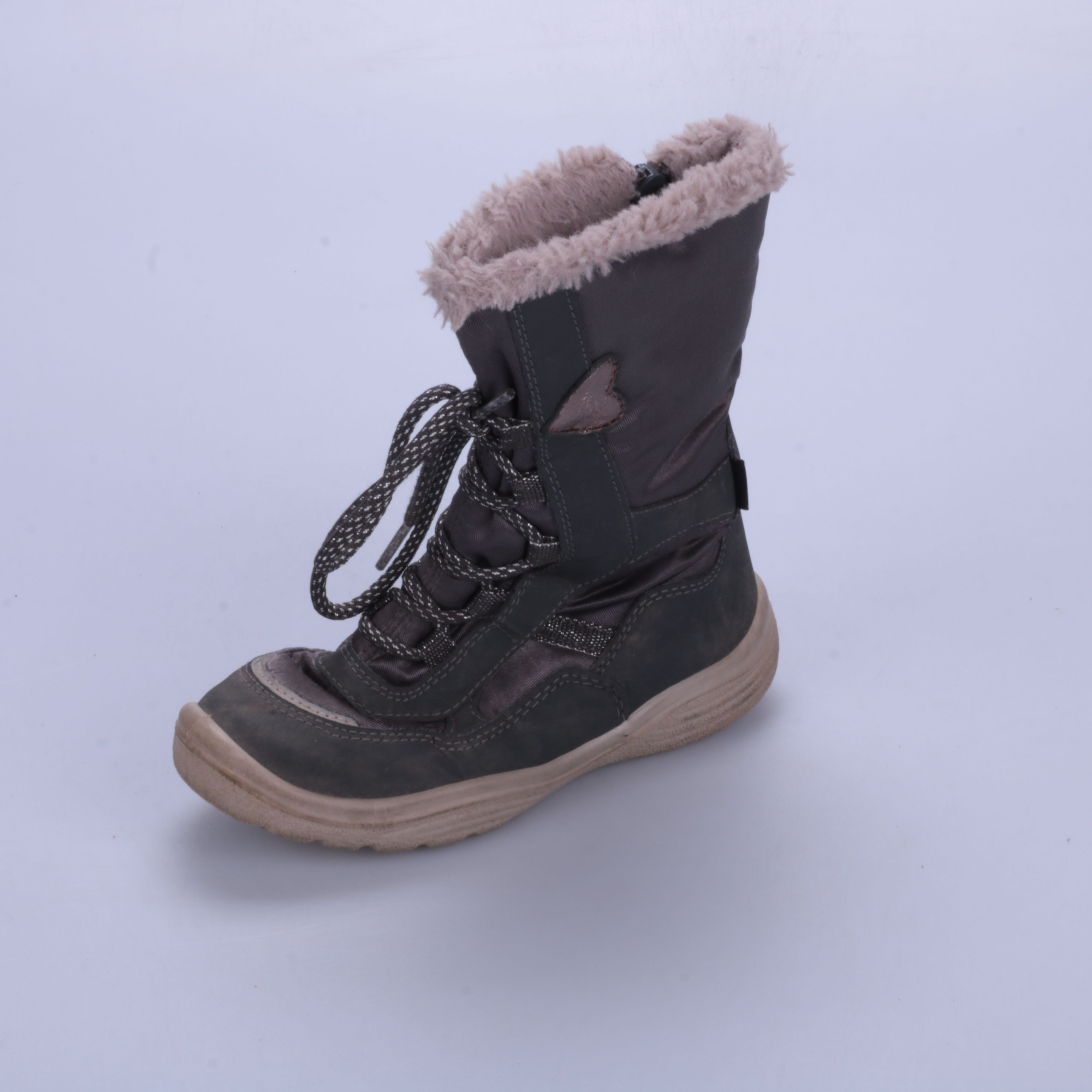 Детские зимние полусапоги для девочки в сером цвете, с меховой окантовкой сверху. Застёгиваются на молнию и дополнительно фиксируются шнуровкой — удобно подгонять по подъёму. Подойдут для прогулок в холодную погоду, подошва рельефная и не скользит так ...