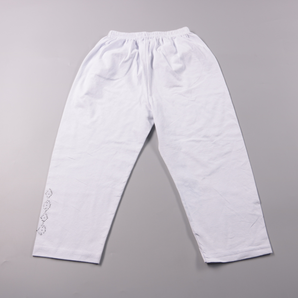 Белые трикотажные брюки на широкой резинке, подойдут для дома, детского сада или на физкультуру. Посадка свободная, по низу аккуратная подгибка, слева есть небольшой декоративный элемент. Резинка мягкая и быстро надеваются без пуговиц и молнии.