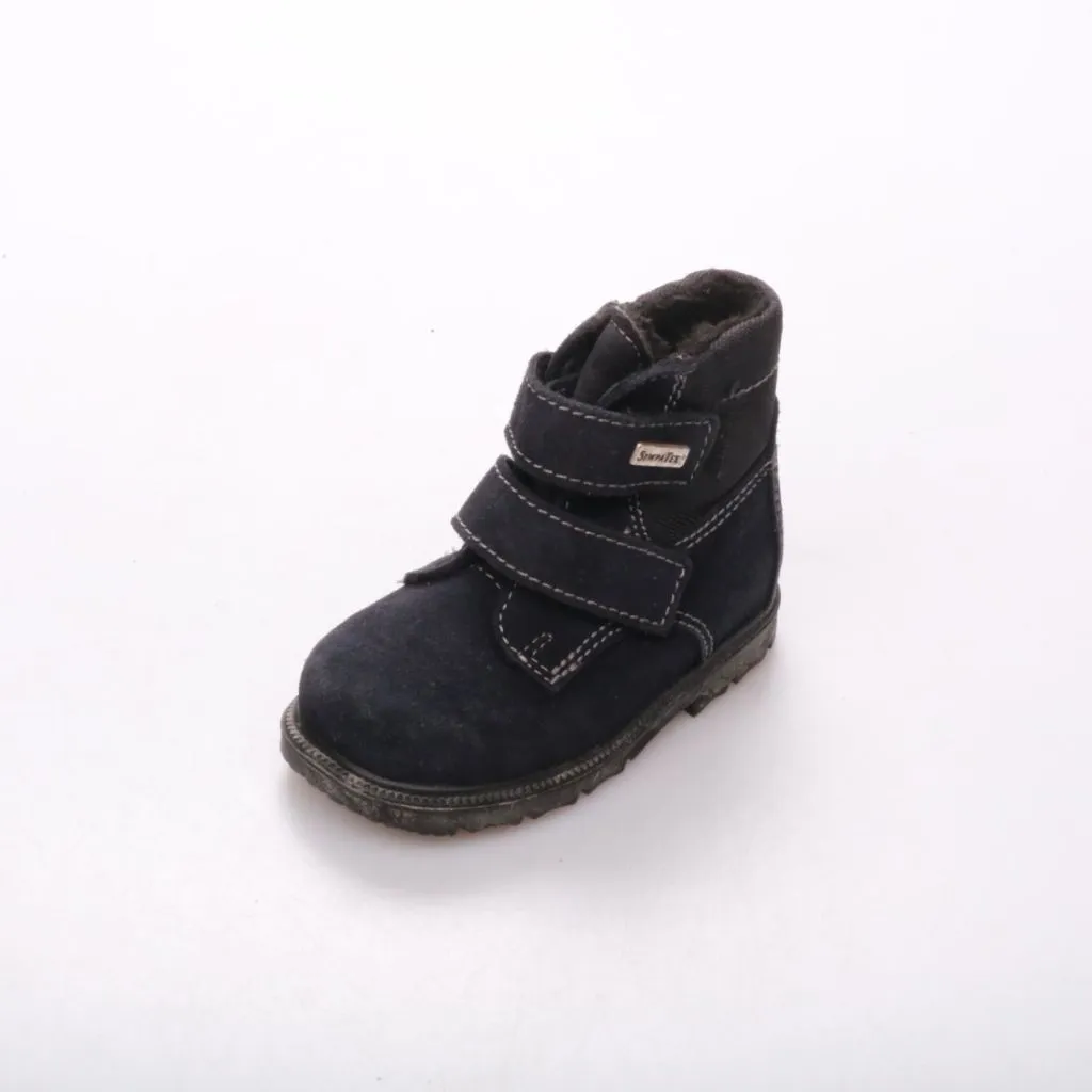 Зимние ботинки Demar тёмно-синего цвета на липучках, с высоким берцем и рельефной подошвой. Подойдут для повседневной носки в холодную погоду и прогулок. Липучки позволяют быстро надевать и надёжно фиксировать обувь на ноге.