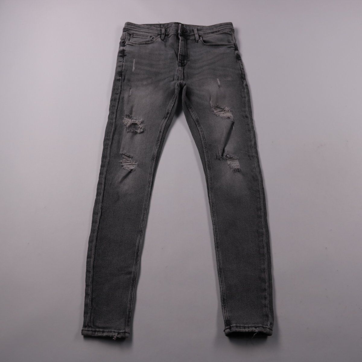 Мужские джинсы River Island серого цвета, зауженная модель с эффектом потертостей и декоративными разрывами. Подойдут для повседневных образов в стиле casual и streetwear. Плотный деним хорошо держит форму и прост в уходе.
