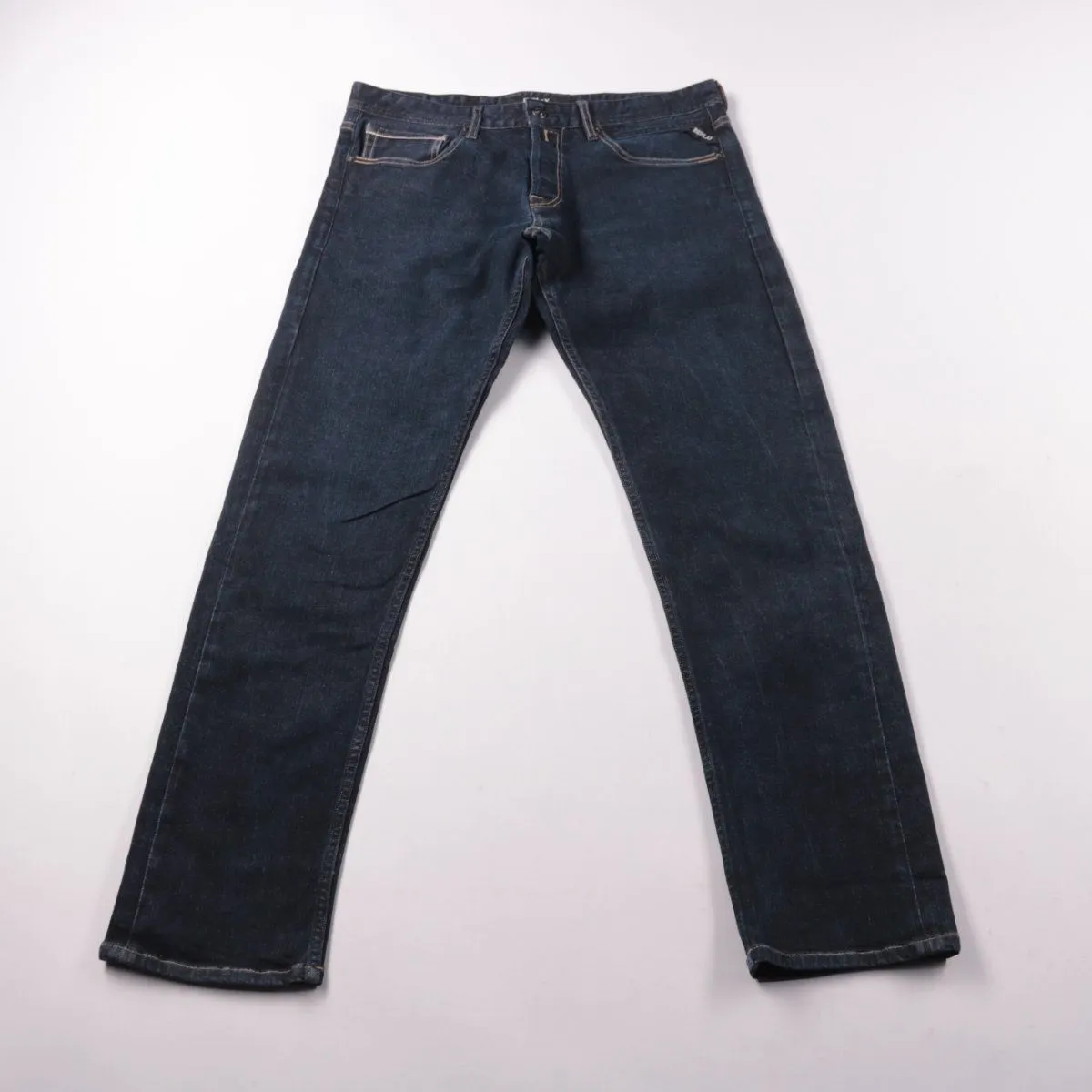 Мужские джинсы Replay из тёмно-синего денима с лёгким эффектом потертости. Подойдут для повседневной носки и неформального офиса, хорошо сочетаются с футболками и рубашками. Ткань со стрейчем даёт более комфортную посадку и свободу движений.