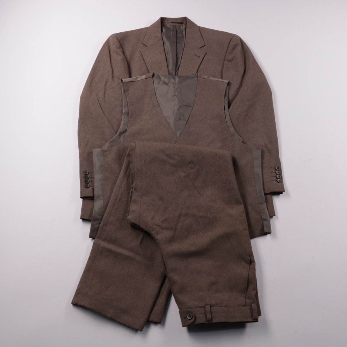 Мужской костюм Canda коричневого цвета: пиджак, жилет и брюки. Подойдёт для офиса, деловых встреч и торжественных мероприятий. Практичный синтетический материал и подкладка (100% полиэстер) просты в уходе и меньше мнутся.
