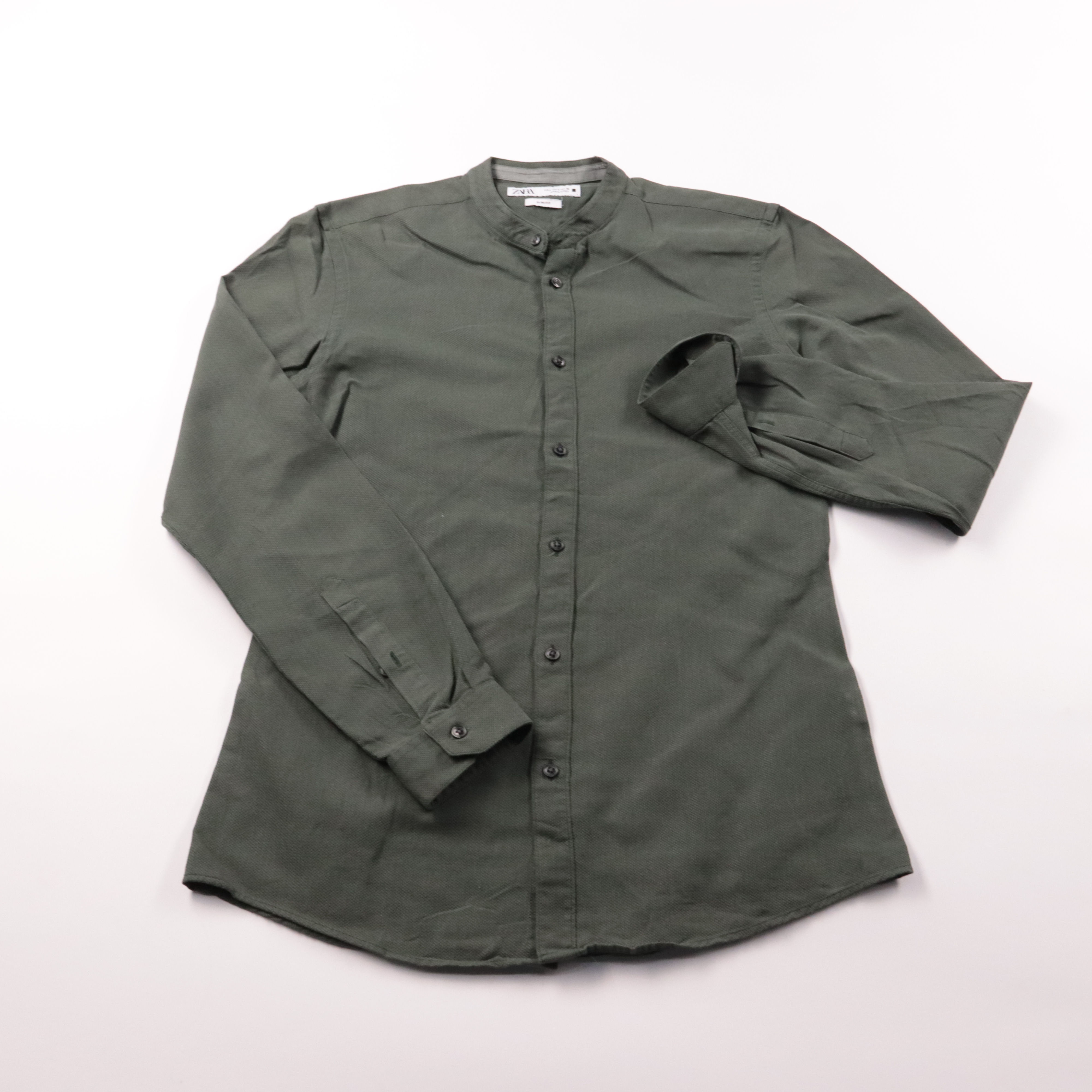Мужская рубашка Zara Slim Fit в тёмно-зелёном (хаки) цвете, на пуговицах и со стойкой-воротником. Подойдёт для повседневных образов и офиса, хорошо сочетается с джинсами и брюками. Практичная ткань с добавлением полиэстера меньше мнётся и проще в уходе.