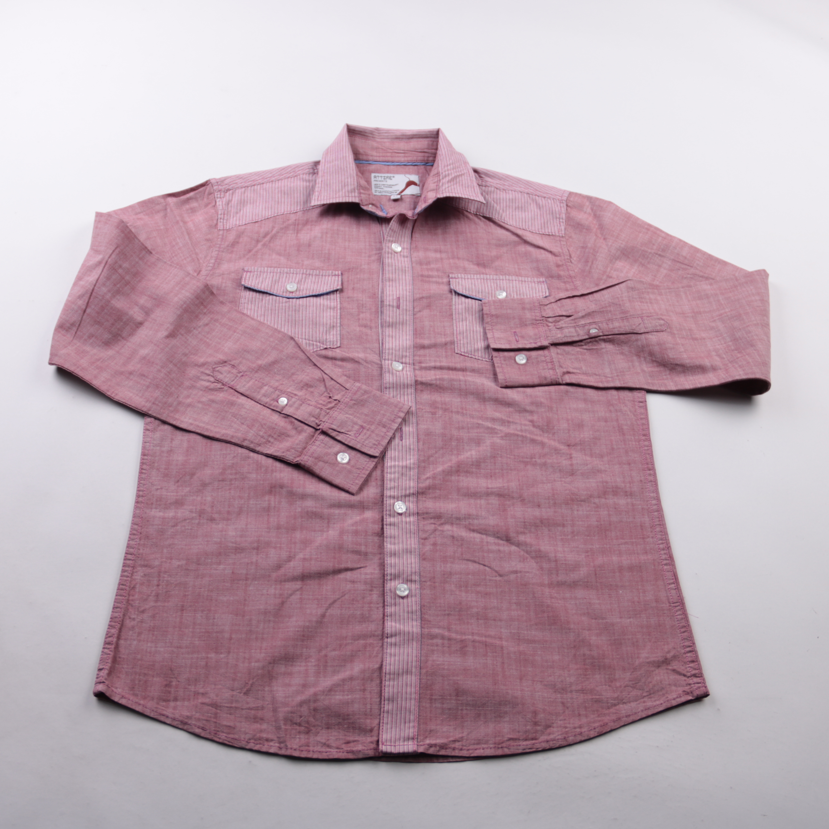 Мужская рубашка Attire из хлопка, розового (пыльно-розового) цвета, с длинным рукавом и двумя нагрудными карманами на пуговицах. Подойдёт для повседневной носки и офиса в стиле casual, хорошо сочетается с джинсами и чиносами. Хлопковая ткань дышит и ко...