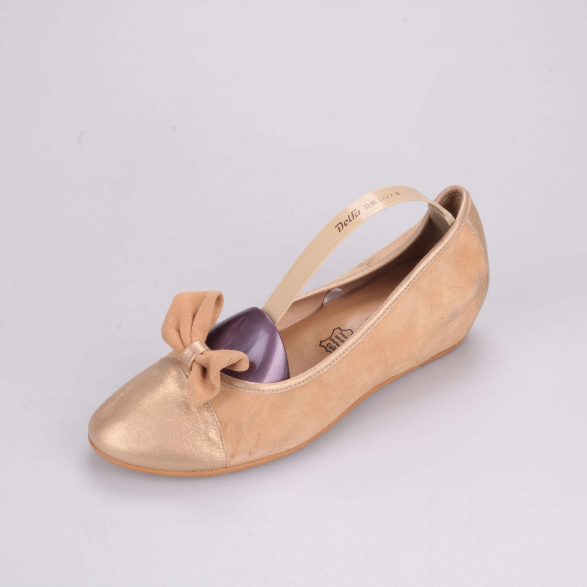 Балетки Costantino из натуральной замши бежевого цвета с золотистым мысом и бантом. Подойдут для повседневных образов, офиса и прогулок, легко сочетаются с платьями и джинсами. Мягкая кожаная стелька делает пару удобной для длительной носки.