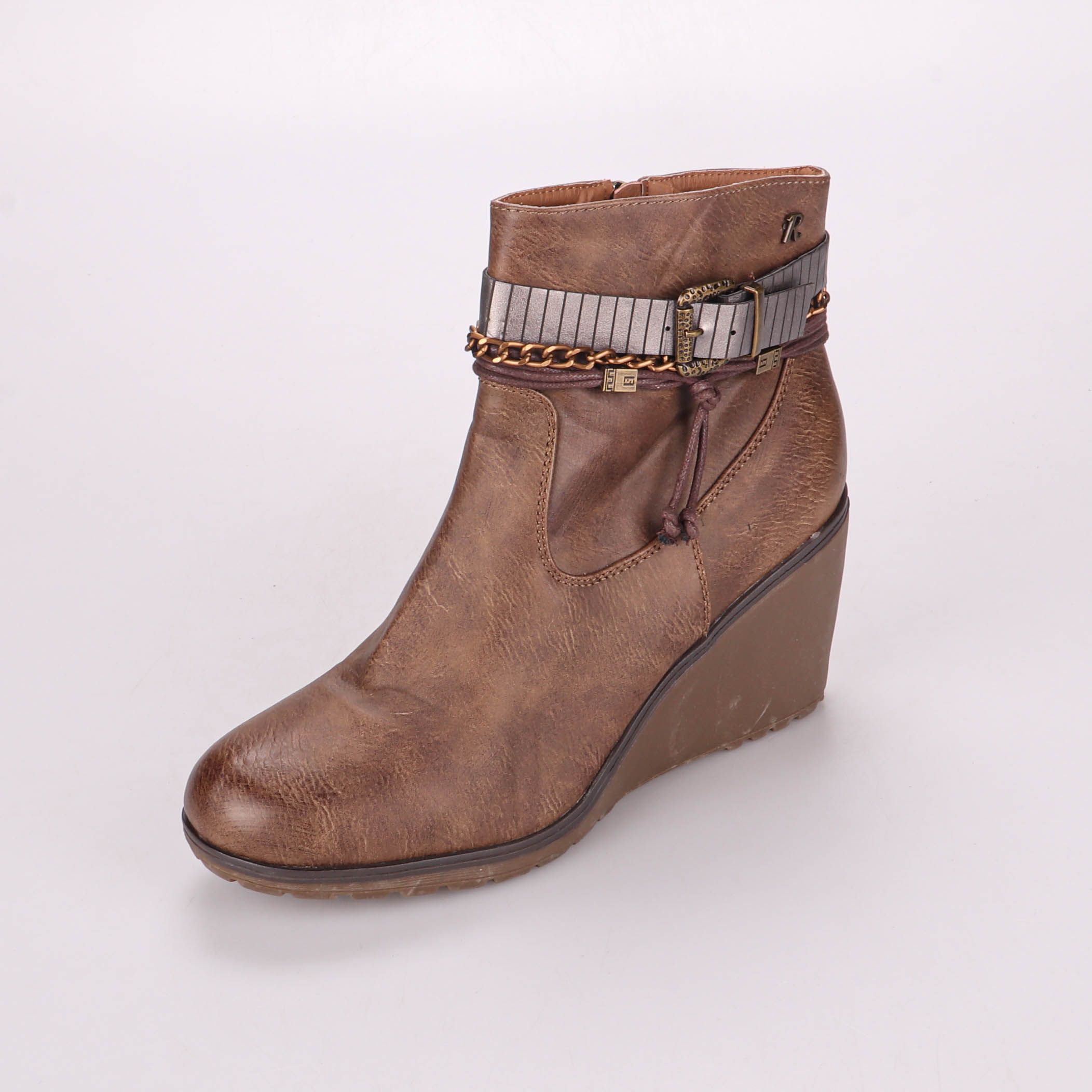 Женские ботильоны в коричневом цвете на устойчивой танкетке, с декоративным ремешком и цепочкой вокруг щиколотки. Подойдут для повседневных образов в межсезонье, хорошо сочетаются с джинсами и платьями. Практичная молния сбоку помогает быстро надевать ...