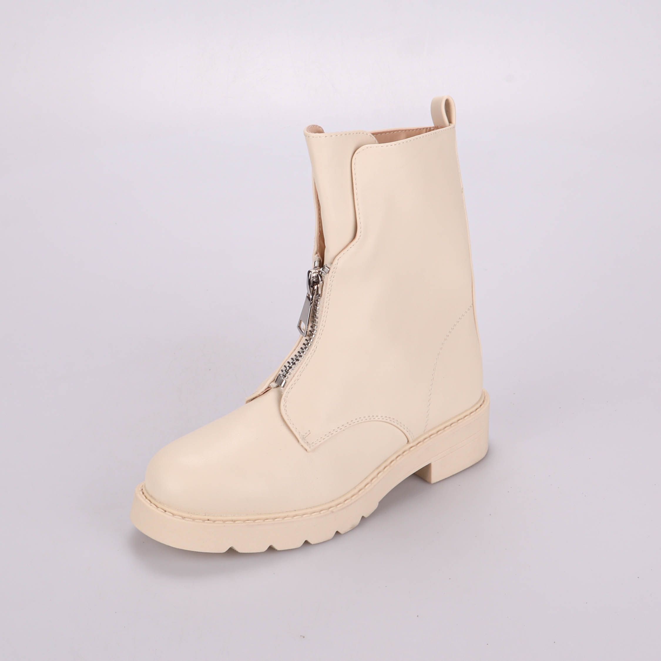 Женские демисезонные ботинки светлого бежевого цвета с фронтальной молнией и массивной подошвой. Подойдут для повседневных городских образов с джинсами или платьями в прохладную погоду. Удобно быстро надевать за счёт молнии, а рельефная подошва даёт лу...