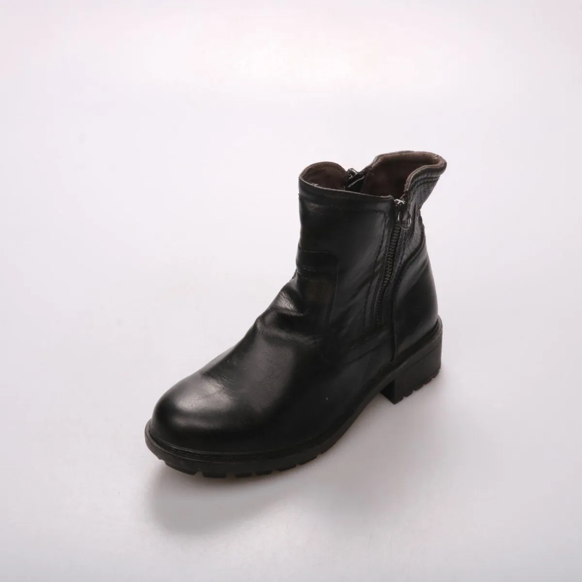 Женские ботинки из чёрной кожи на устойчивом невысоком каблуке, с боковой молнией. Подойдут на каждый день в демисезон и прохладную погоду, хорошо смотрятся с джинсами и пальто. Практичная рельефная подошва даёт уверенное сцепление и меньше скользит.