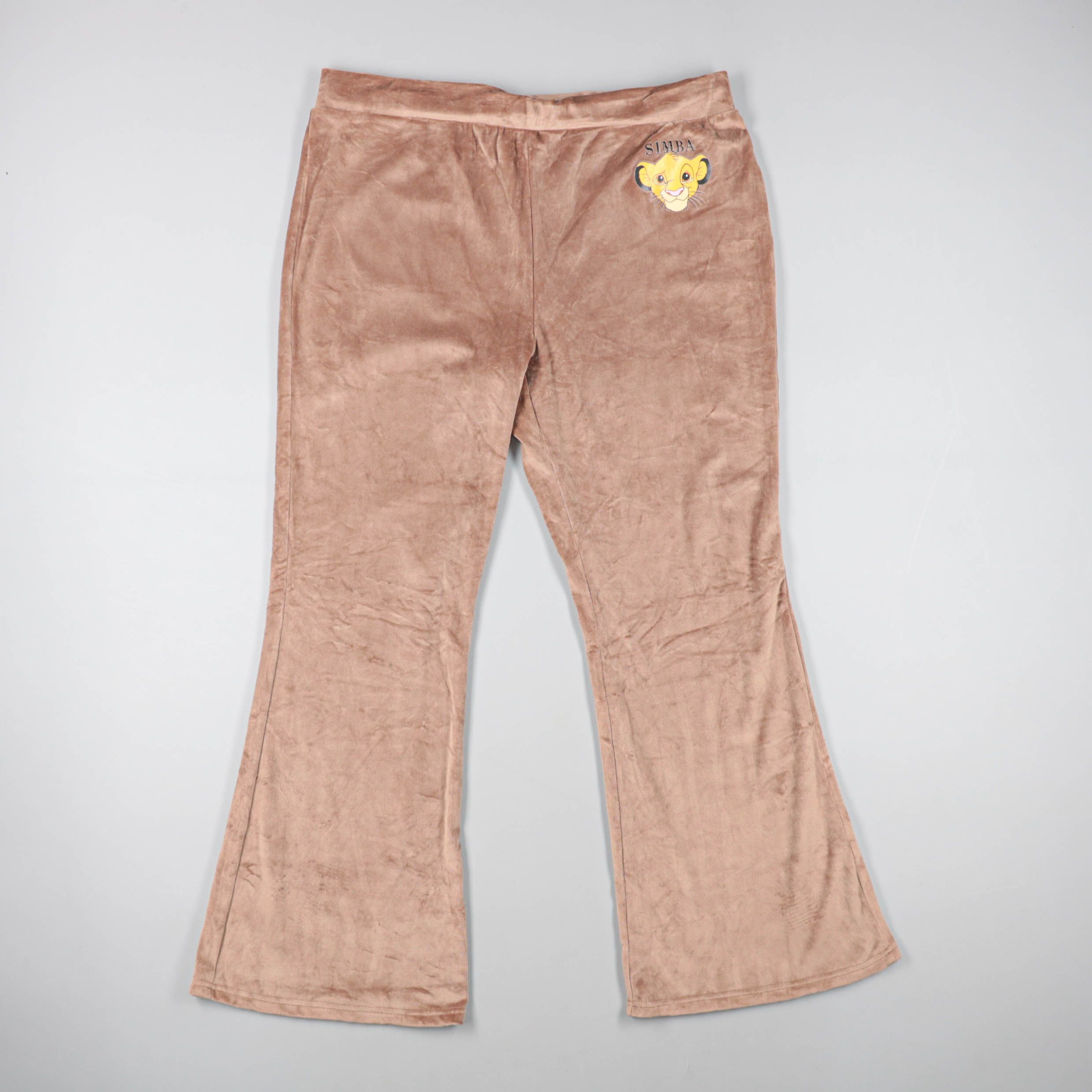 Женские велюровые брюки с принтом Simba на бедре и расклешёнными штанинами. Подойдут для дома и отдыха, мягкая ткань приятна к телу и хорошо тянется. Удобный пояс без застёжек обеспечивает комфортную посадку.