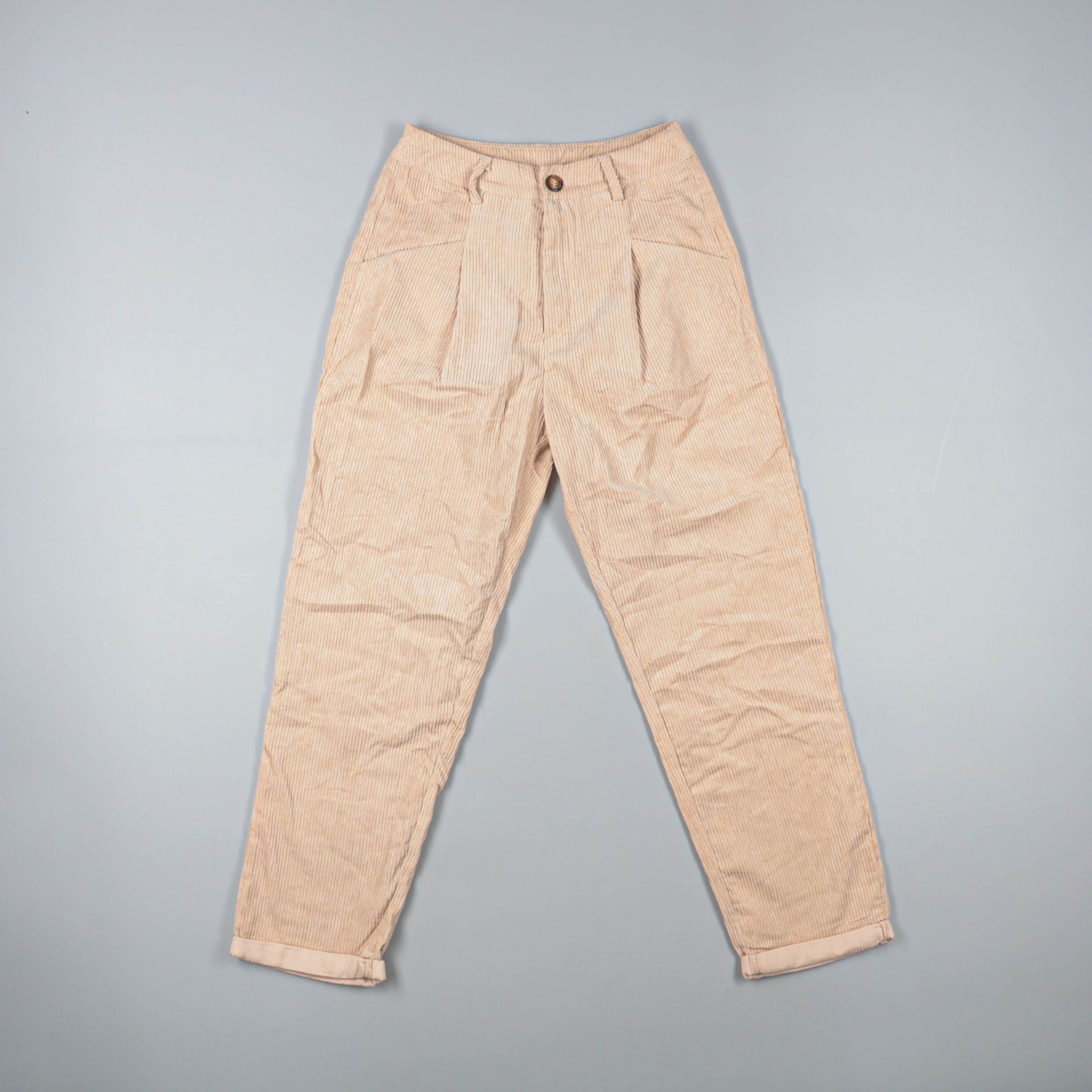 Женские вельветовые брюки бежевого цвета с высокой посадкой и складками спереди. Подойдут для повседневных образов в офис или на прогулку, хорошо сочетаются с рубашками и свитерами. Плотный вельвет практичен в носке и держит форму.