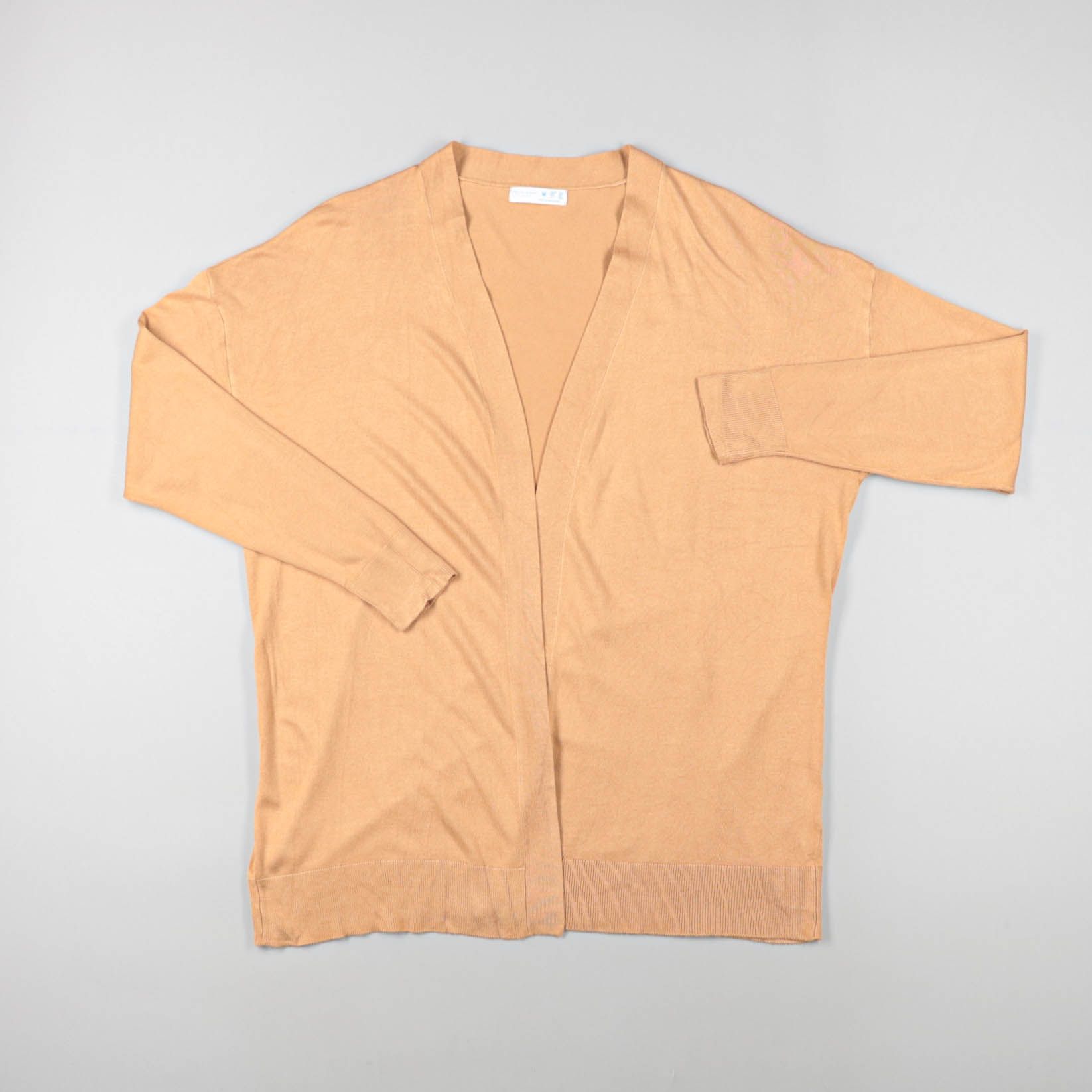 Женский кардиган без застёжки в светлом бежево-персиковом оттенке, с V-образным вырезом и длинным рукавом. Подойдёт для офиса и на каждый день, удобно носить поверх топа или блузы. Мягкий тонкий трикотаж легко сочетается с базовым гардеробом и не стесн...