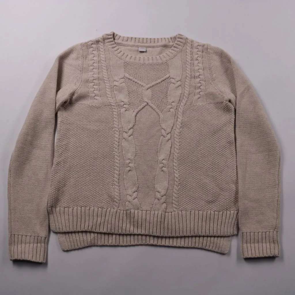 Вязаный свитер s.Oliver бежевого цвета с круглым вырезом и рельефными косами спереди. Подойдёт для зимы и прохладной погоды, удобно носить как самостоятельный слой или под куртку. Практичный плюс — плотная вязка хорошо сохраняет тепло.