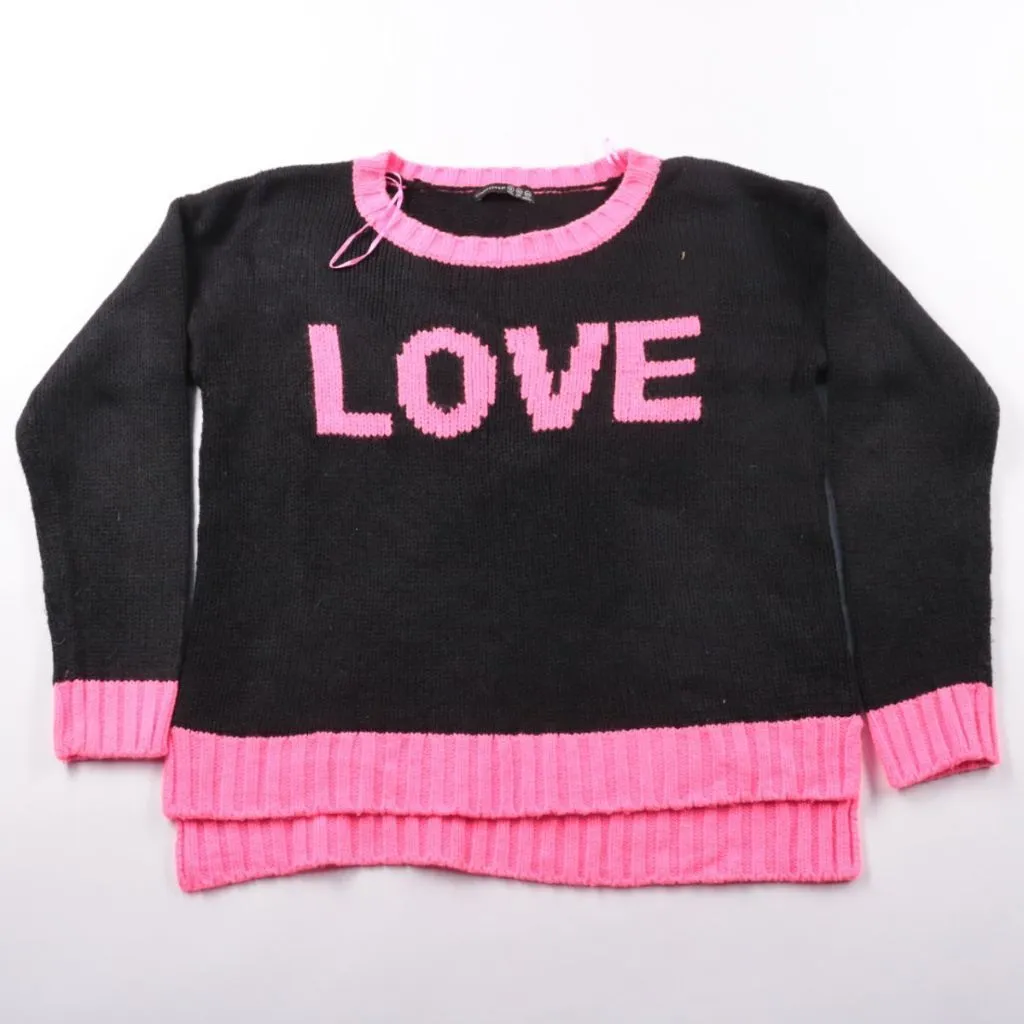Вязаный свитер Atmosphere чёрного цвета с ярко-розовыми манжетами, воротом и надписью LOVE на груди. Подойдёт для повседневных образов в прохладную погоду и хорошо сочетается с джинсами или юбкой. Акриловая пряжа быстро сохнет и проста в уходе.