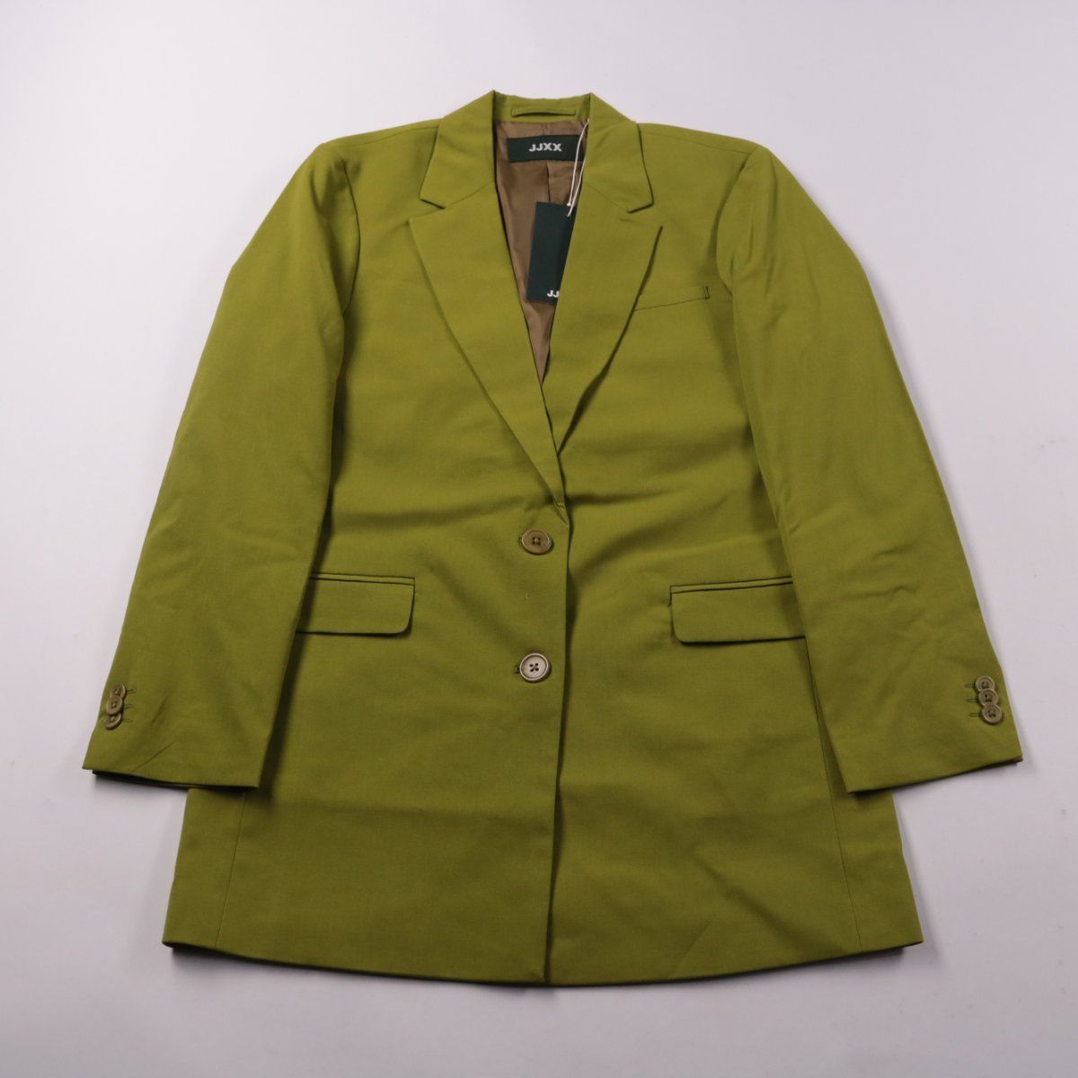 Женский удлинённый пиджак JJXX oversize в оливково-зелёном цвете с лацканами и застёжкой на пуговицы. Подойдёт для офиса и повседневных образов, хорошо сочетается с брюками и джинсами. Практичный плюс — плотная ткань со слегка тянущимся составом и подкладкой.