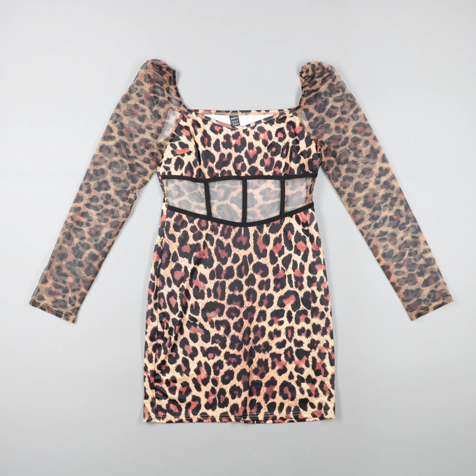 Женское платье Shein с леопардовым принтом и квадратным вырезом, с полупрозрачными сетчатыми рукавами и вставкой на талии. Подойдёт для вечера, свидания или выхода в клуб, хорошо смотрится с однотонными аксессуарами. Эластичный материал облегает фигуру...