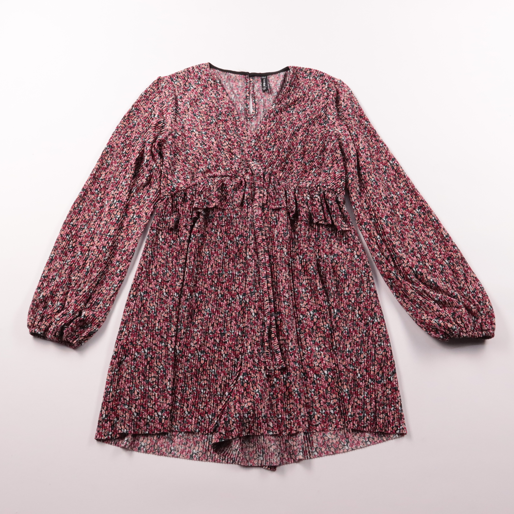 Женское повседневное платье FB Sister с мелким цветочным принтом и V-образным вырезом, талия подчёркнута кулиской и оборкой. Подойдёт для города и на каждый день в тёплую весну/осень, хорошо смотрится с ботинками или кедами. Лёгкая плиссированная ткань...