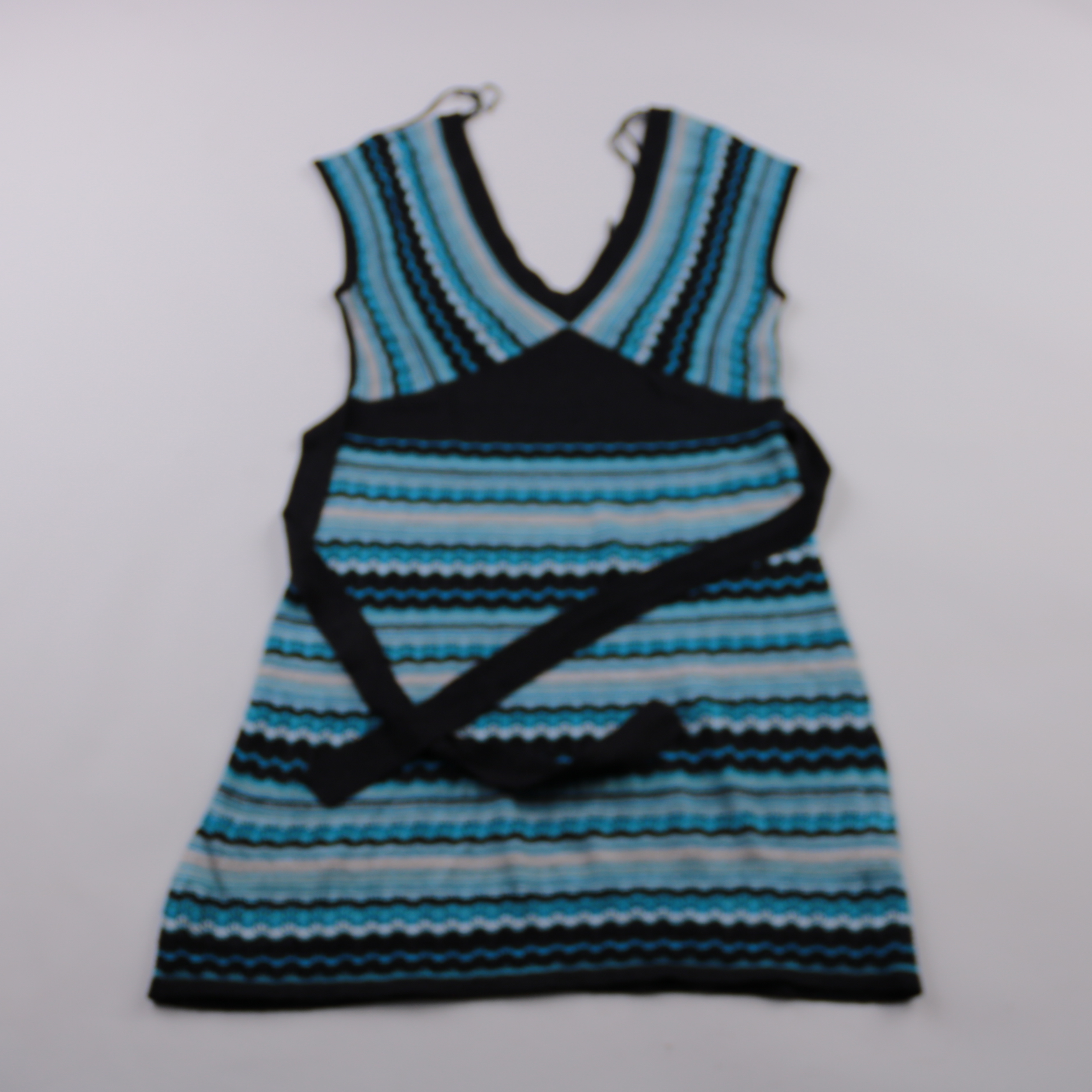 Повседневное платье M&Co без рукавов с V-образным вырезом и поясом, в полоску в голубо-чёрной гамме с лёгким мерцанием. Подойдёт для лета и отпуска, можно носить с сандалиями или балетками. Акриловый трикотаж практически не мнётся и удобен в уходе.