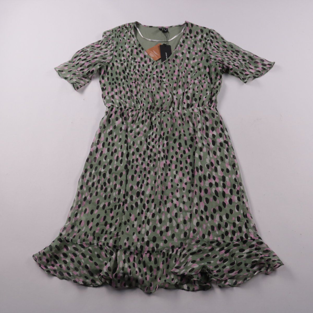 Повседневное платье Vero Moda в оттенке Hedge Green с принтом в чёрно-розовые пятна, короткими рукавами-воланами и воланом по низу. Подойдёт для тёплой погоды и прогулок благодаря лёгкой ткани и свободной посадке. Практичный плюс — полиэстер легко стирается и быстро сохнет.