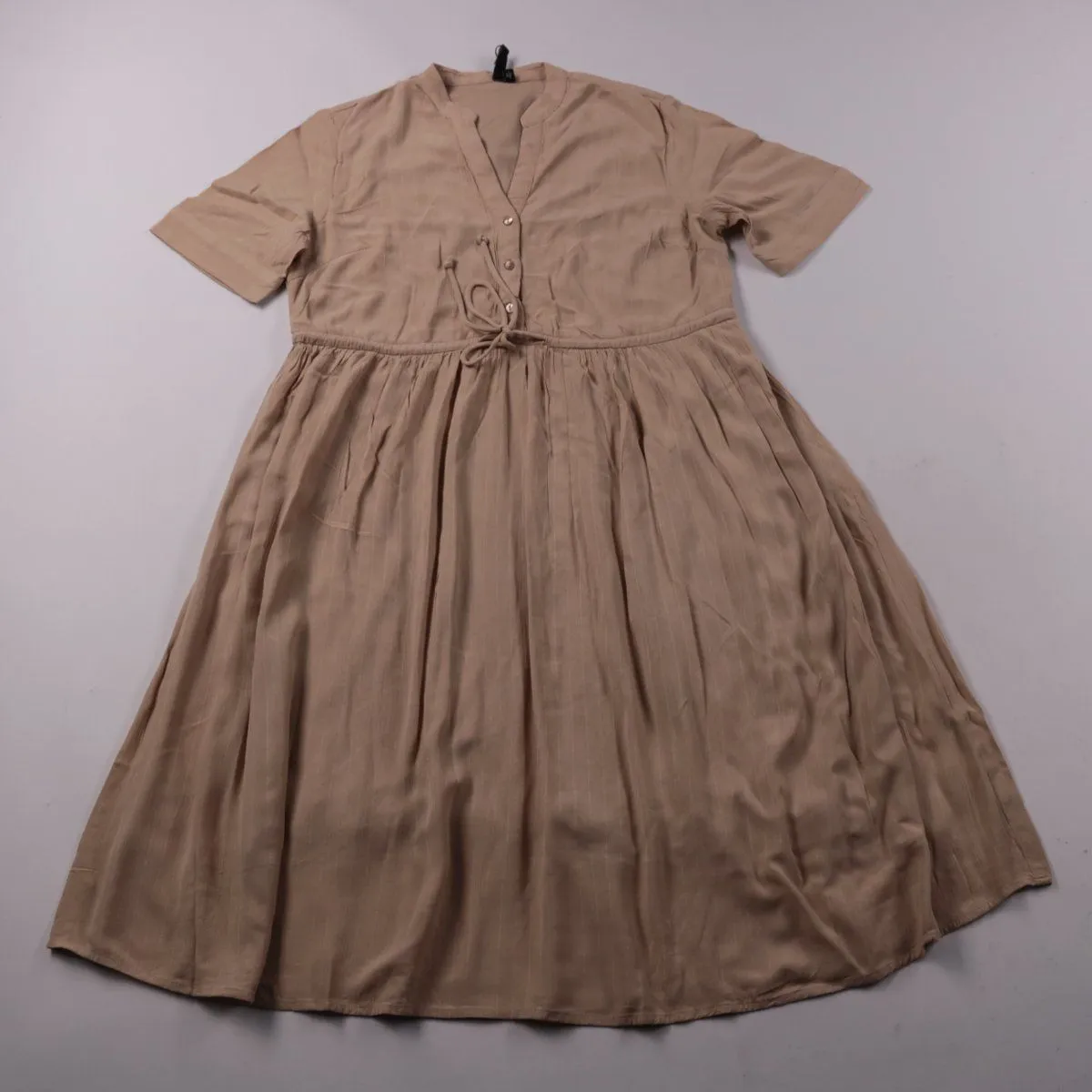 Повседневное платье Pieces бежевого цвета из мягкой вискозы, с коротким рукавом и пуговицами спереди. Модель с завышенной талией на кулиске и свободной юбкой подойдёт для прогулок и офиса в тёплую погоду. Лёгкая ткань комфортно дышит и почти не мнётся в носке.