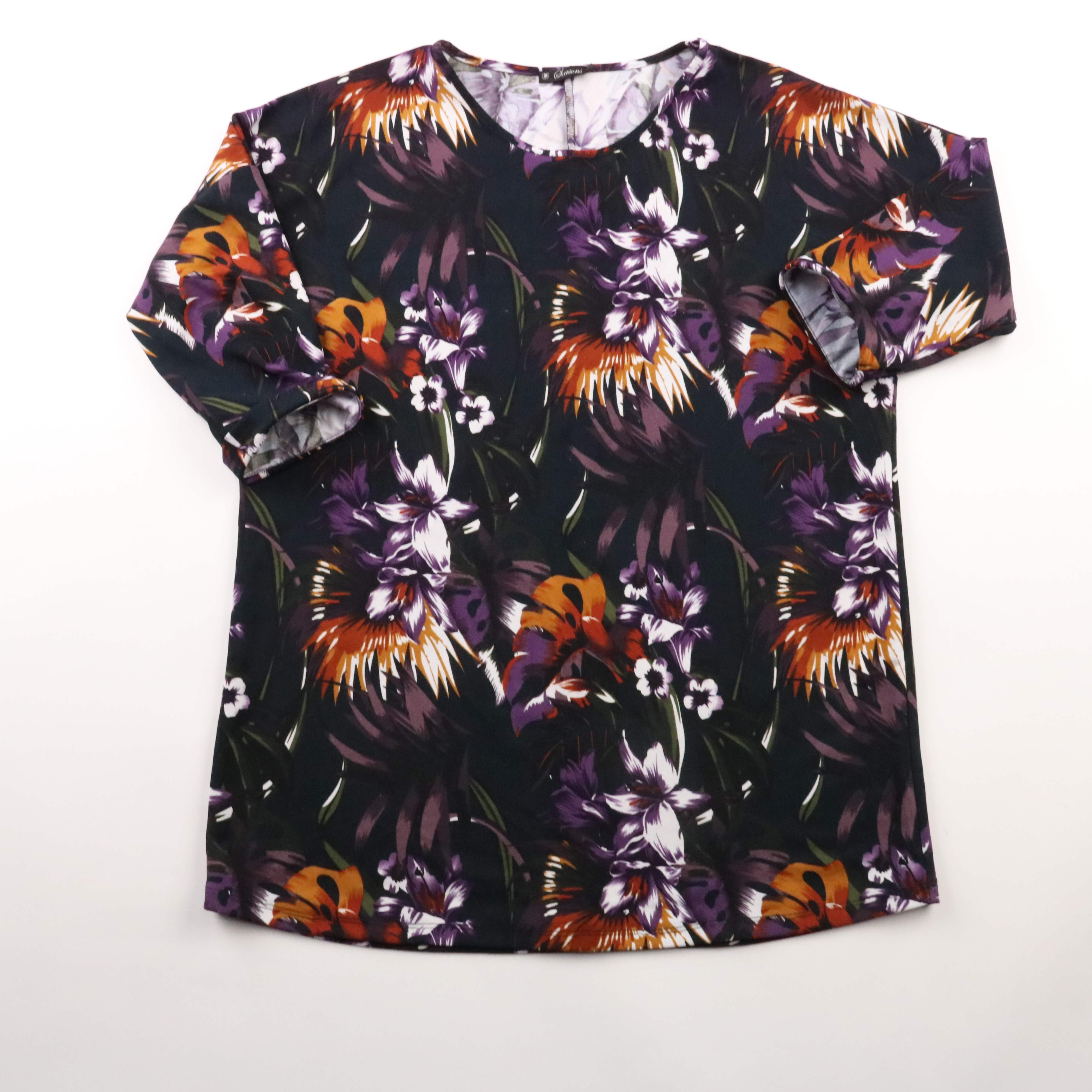 Блузка Stabomis с коротким рукавом и ярким цветочным принтом на тёмном фоне. Подойдёт для офиса или на каждый день с однотонными брюками/юбкой. Ткань лёгкая и почти не мнётся, удобно брать с собой в поездки.