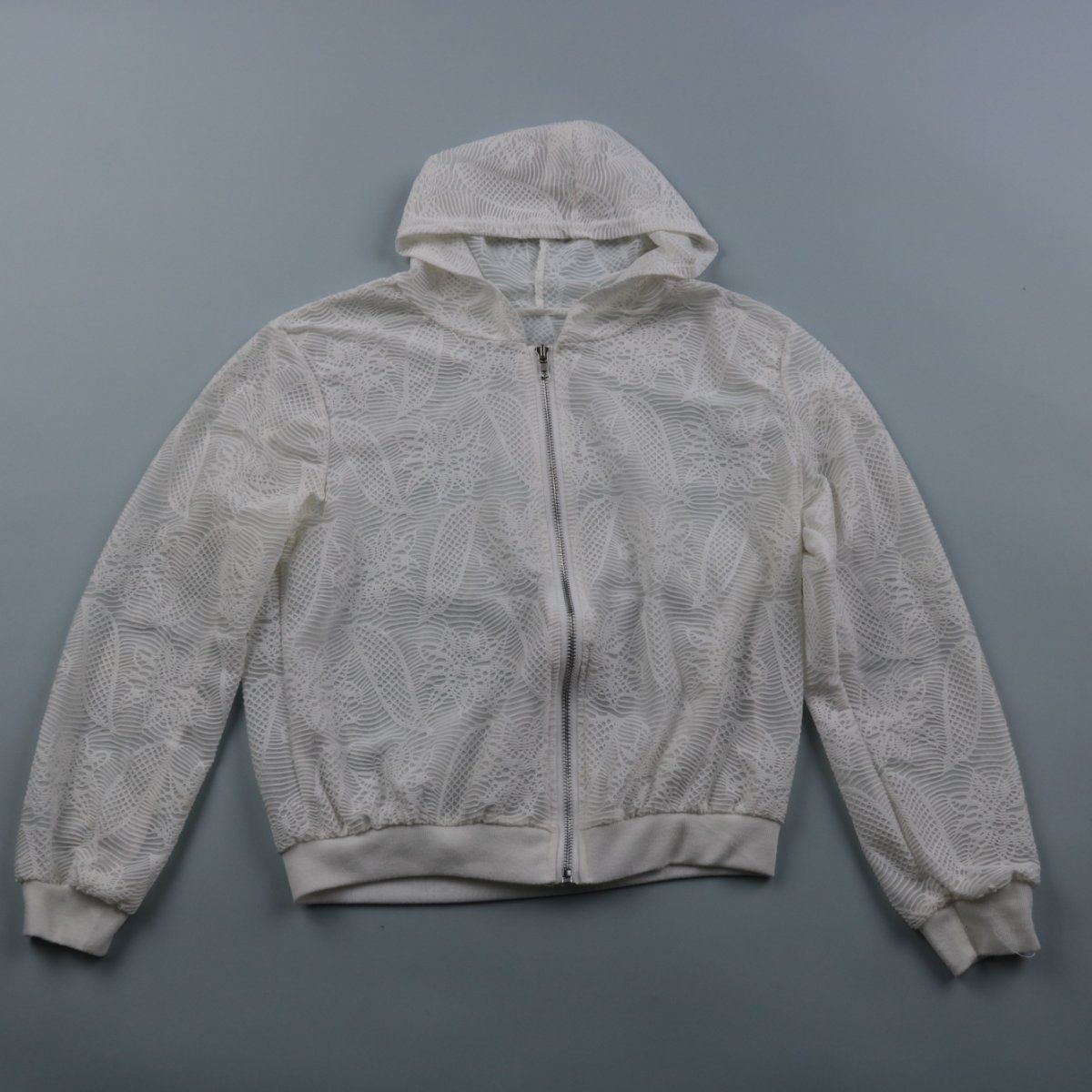 Лёгкая женская толстовка на молнии с капюшоном, выполнена из ажурной ткани с цветочным узором. Подойдёт для тёплой погоды и как накидка на топ/платье. Практичный плюс — материал хорошо пропускает воздух и быстро сохнет.