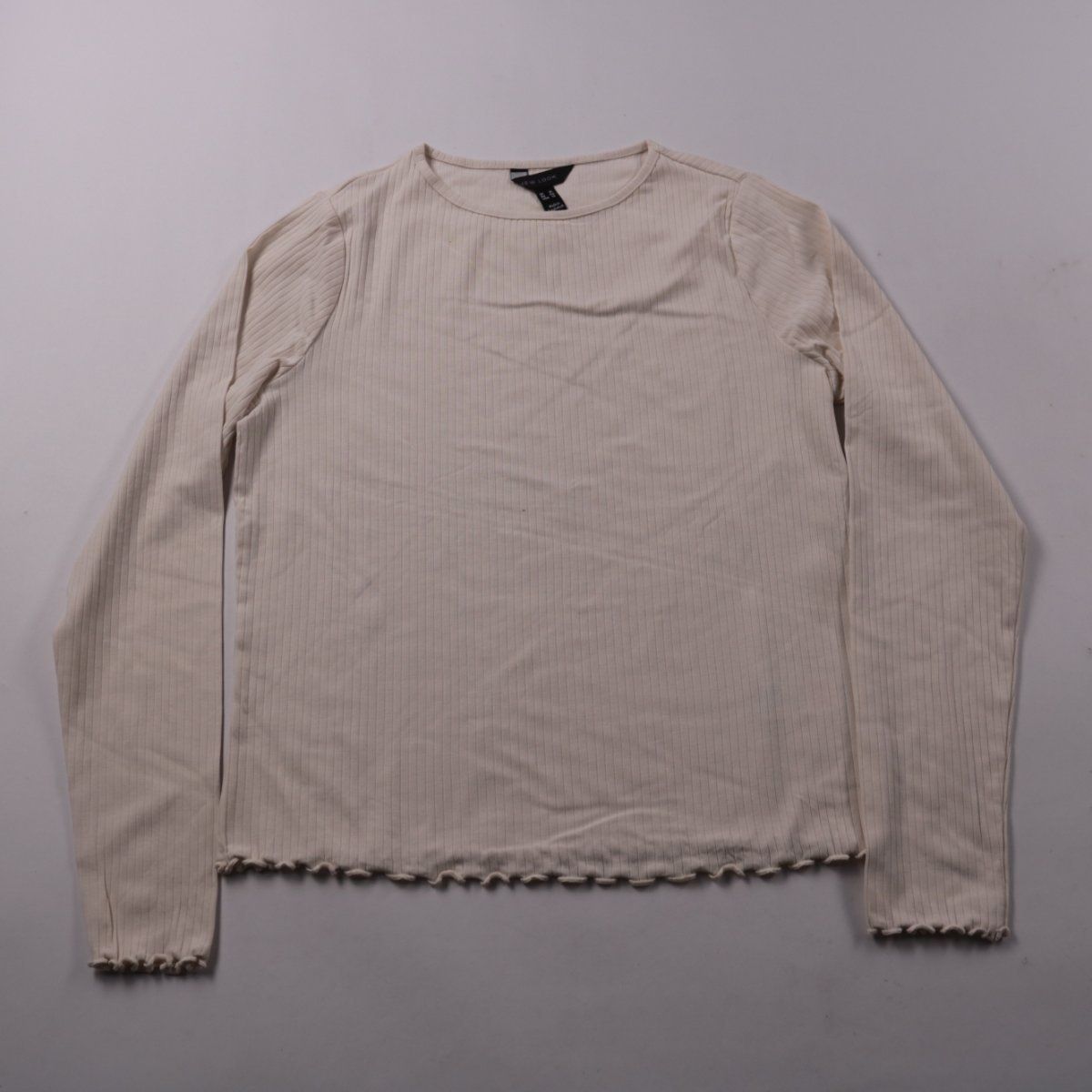 Лонгслив New Look светло-бежевого цвета из трикотажа в рубчик с фигурной (lettuce) обработкой низа и манжет. Подойдёт для повседневных образов и как базовый слой в прохладную погоду. Эластичный материал хорошо тянется и комфортно садится по фигуре.