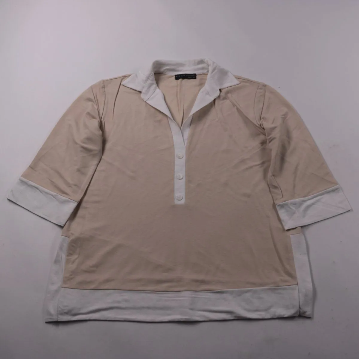 Женское поло Peruzzi бежевого цвета с белой отделкой по воротнику, планке и манжетам. Подойдёт для повседневных образов и спокойного офисного дресс-кода. Трикотажная ткань комфортна в носке и легко сочетается с базовым низом.