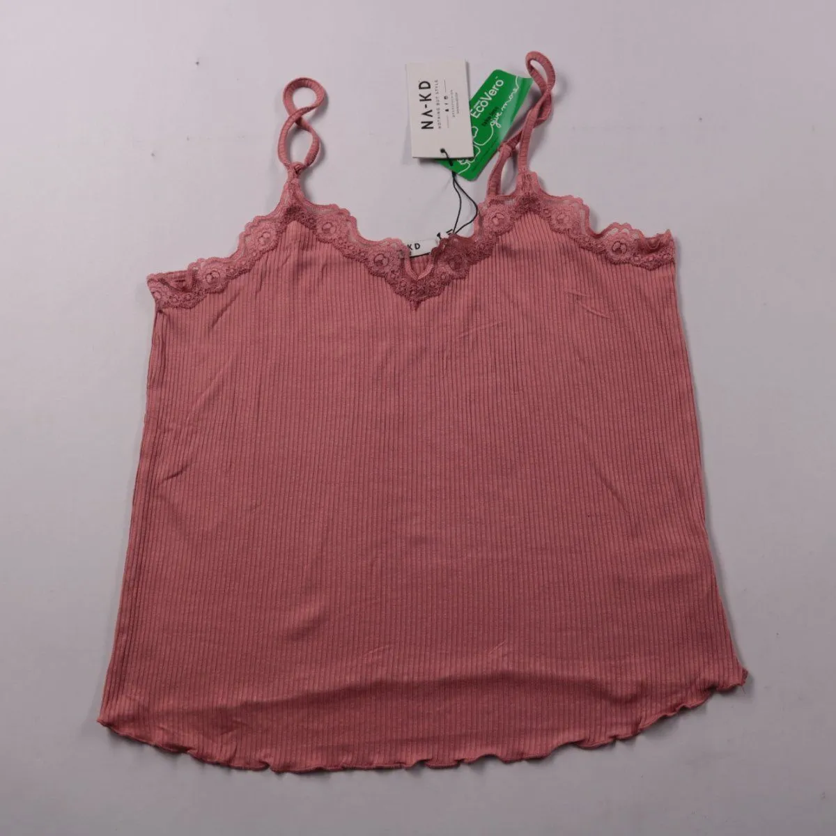 Женский топ NA-KD в рубчик с кружевной отделкой по вырезу и тонкими бретелями. Подойдёт для лета и как базовый слой под жакет/кардиган. Эластичная ткань хорошо тянется и комфортно садится по фигуре.
