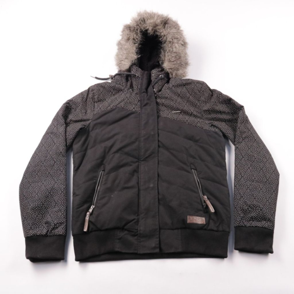 Зимняя куртка Ragwear с утеплением и капюшоном с искусственным мехом, выполнена в чёрно-сером цвете с мелким принтом на плечах и рукавах. Подойдёт для повседневной носки в холодную погоду и прогулок по городу. Практичный плюс — застёжка на молнии и удо...