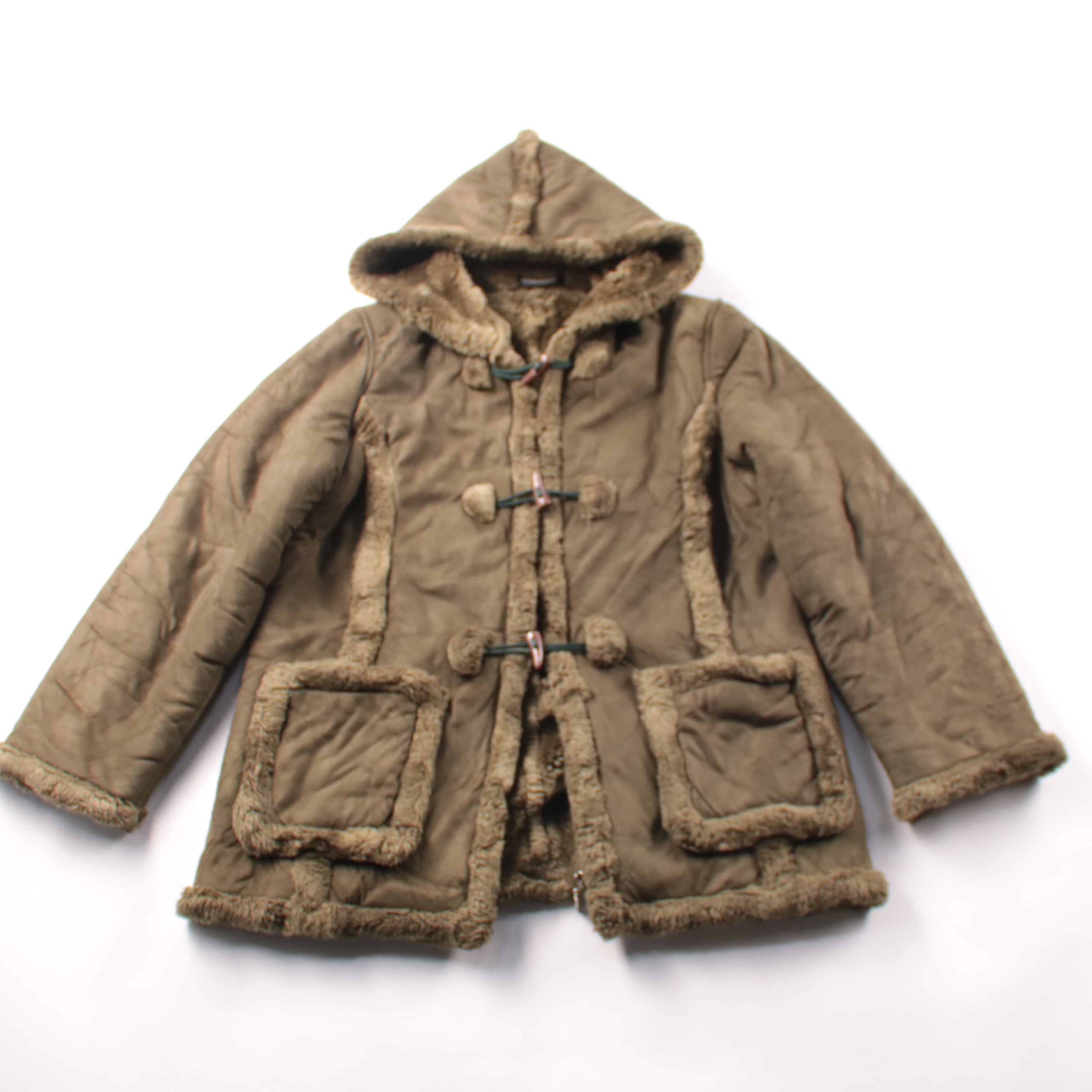 Дублёнка Rongdata с капюшоном и отделкой под мех по краю и швам, застёжка на клеванты. Подойдёт для зимних прогулок и повседневной носки в прохладную погоду. Тёплая подкладка и глубокие карманы делают её практичной на каждый день.