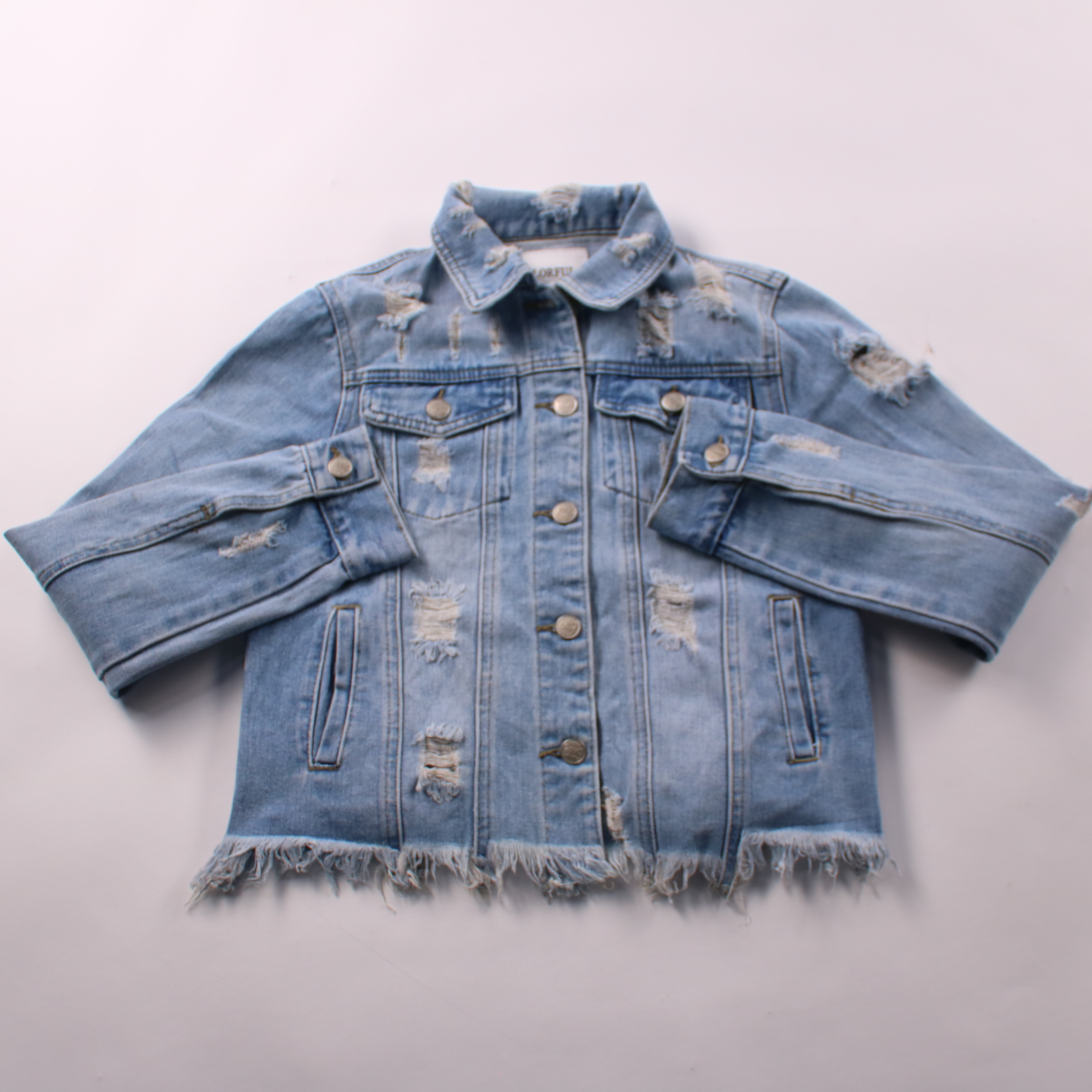 Джинсовая куртка Colorful из светло-голубого денима с декоративными потертостями и бахромой по низу. Подойдет для весны и прохладного лета, легко сочетается с платьями, джинсами и кедами. Плотный материал и застежка на пуговицы удобны для повседневной ...