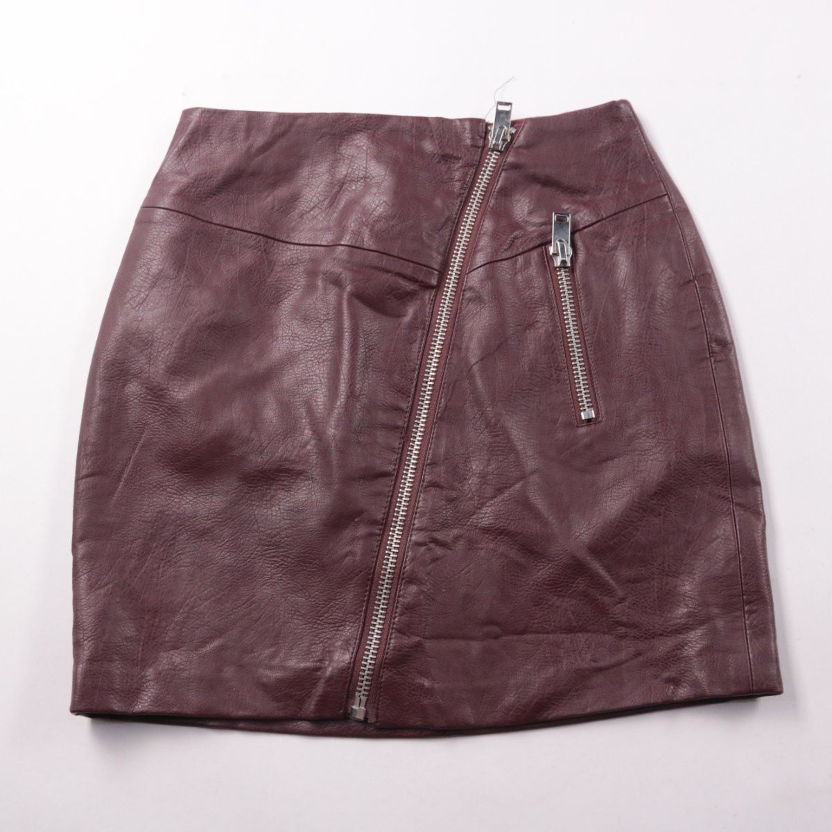 Юбка Stradivarius из материала под экокожу бордового цвета, мини-длины, с центральной молнией и декоративной молнией-карманом спереди. Подойдёт для повседневных образов и выхода в город в демисезон и прохладное лето. Практичный материал легко протирать и быстро приводить в аккуратный вид.